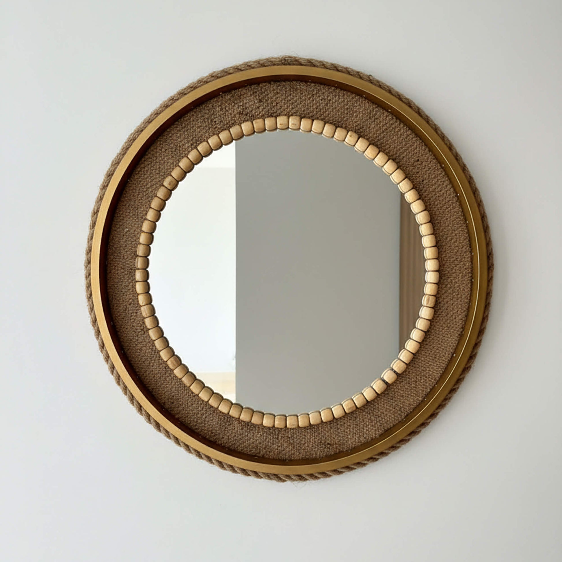 Espejo redondo decorativo elaborado a mano con hilo y cuerda de yute, y cuentas de madera cuidadosamente trabajado por artesanos mexicanos. Su diseño destaca por la combinación de texturas naturales, un marco tejido en yute y un delicado detalle interior que enmarca el espejo, aportando profundidad y carácter a la pieza.